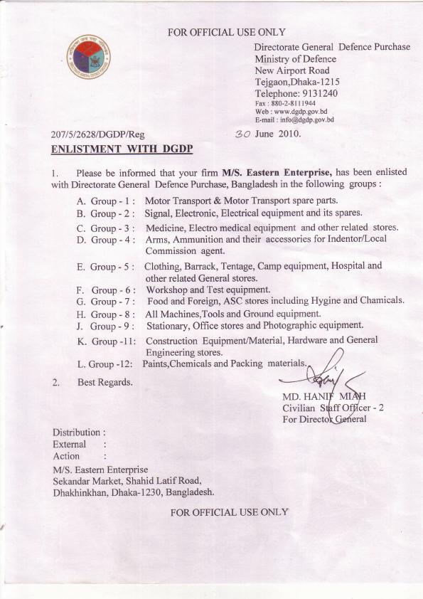 We have got the permission from the ministry of defence for supplying various defence items for Bangladesh Government.